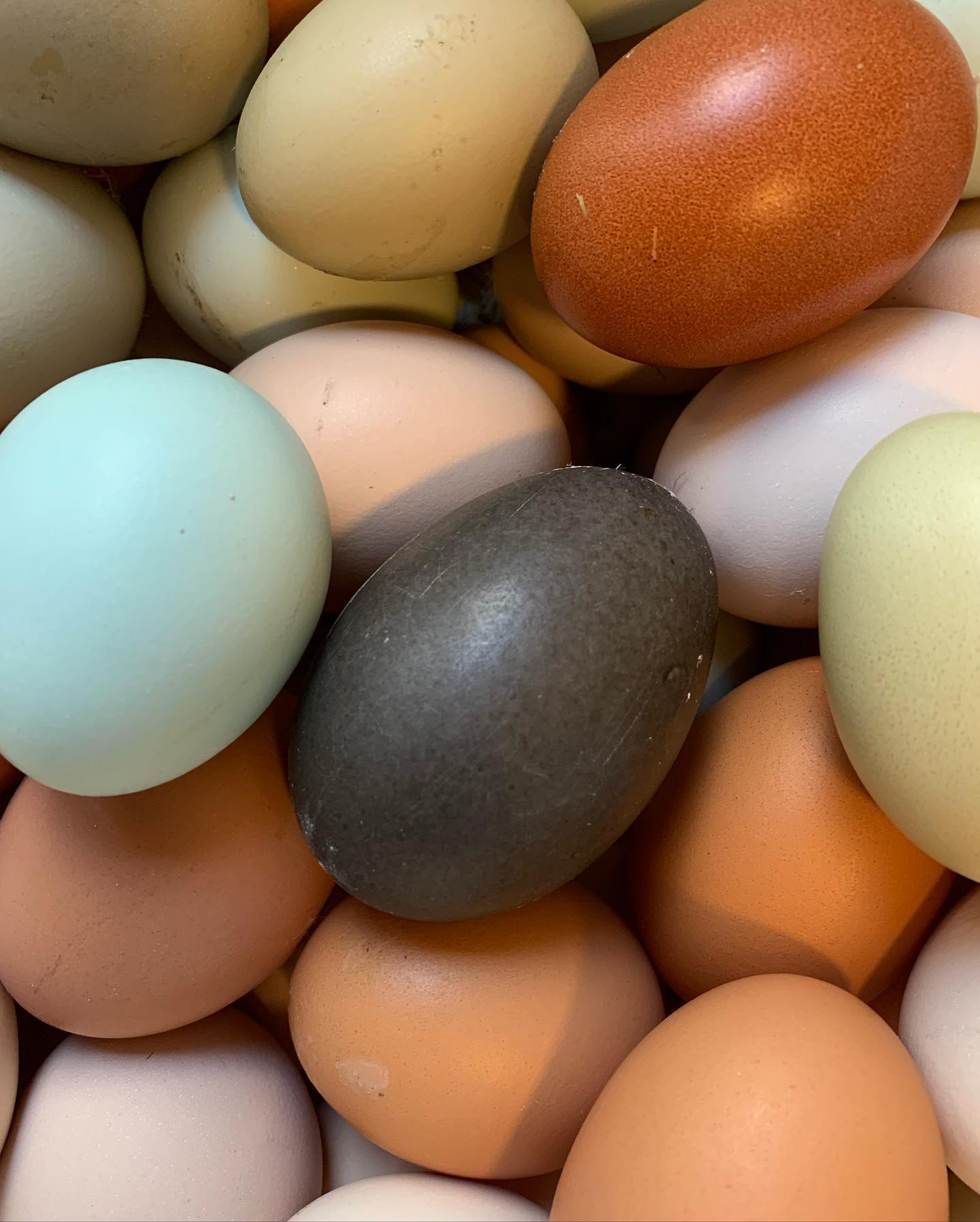 Fåglarna hos Rosa Skattlådan värper ägg i de mest fantastiska färger och storlekar! Allt ifrån vakteläggens små söta ägg i prickiga naturfärger till våra andra fåglars benvita, gröna, turkosa, rosa och kanelfärgade ägg. Äggen har en härligt krämig konsistens och kraftfull smak.
